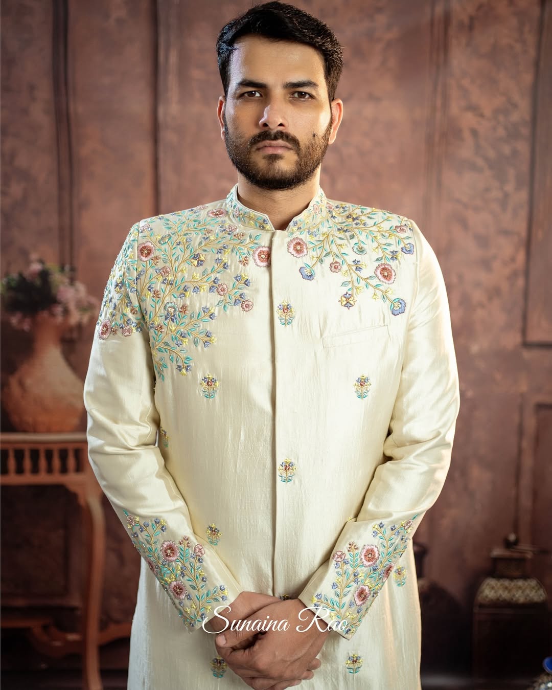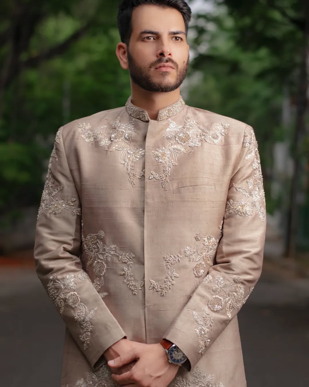 Raw Silk Sherwani with Intricate Zardozi Embroidery